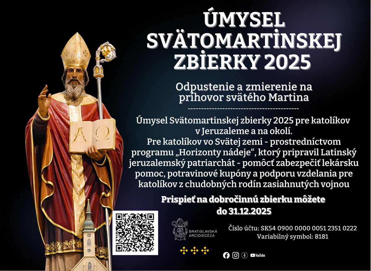 Tradičná Svätomartinská zbierka, ktorá sa koná v nedeľu 9. novembra je určená na pomoc katolíkom v Jeruzaleme a v okolí cez program „Horizonty nádeje“, ktorý pripravil Latinský jeruzalemský patriarchát na čele s kardinálom Pierbattistom Pizzaballom. “Chcem vám poďakovať z Jeruzalema za prejav solidarity s jeruzalemskou cirkvou a za podporu projektov obnovy a výstavby a pomoci rodinám zasiahnutých vojnou najmä v Gaze, ale nielen tam,” povedal vo videoposolstve kardinál Pizzaballa s tým, že ako jeruzalemská cirkev sú odhodlaní zostať v Gaze a obnoviť všetko, čo bolo zničené.