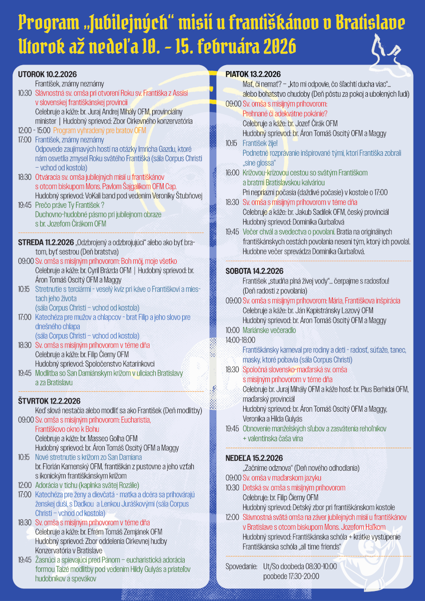 Bratia františkáni srdečne pozývajú na Františkánske misie, ktoré v rámci Roka sv. Františka budú prebiehať v kostole Zvestovania Pána (františkánsky kostol v Bratislave) od utorka 10. februára do nedele 15. februára 2026.